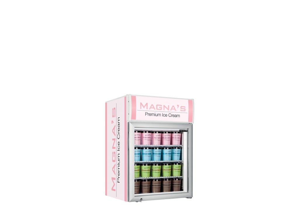 Řada stolních mrazicích skříní UF-GCP se dodává s reklamním panelem s LED osvětlením, který pomůže přitáhnout pozornost zákazníků. Snadno ji přizpůsobíte svým požadavkům, protože má nastavitelné police a nožky. Umístěte mrazicí skříň na pult, abyste podpořili impulzivní prodej.Doplňkové parametry