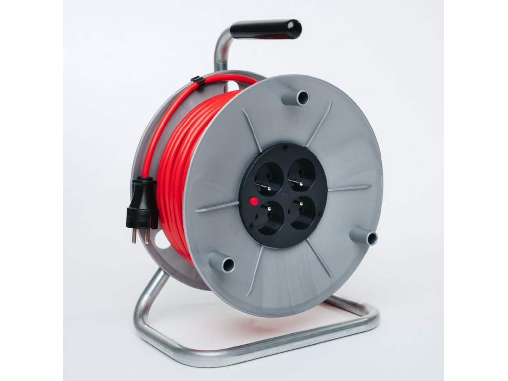 Naviják prodlužovacího přívodu s vestavnou zásuvkou 4 x 2P+PE a 50m kabelem H05RR-F3G1,5jmen. napětí: 230V~, krytí: IP20, max. zatížení: navinutý 1000W/230V~/ rozvinutý 3000W/230V~hmotnost 6,4 kgrozměry 290 x 200 x 360 mmprůměr cívky 275 mm Certifikováno dle ČSN EN 61242cívka z odolného plastu - pro pohodlné navinutí celé délky kabelustabilní stojánek z ocelové pozinkované trubky s izolovanou rukojetí - pro snadnou manipulacivestavná 4zásuvka - pro připojení více spotřebičůbrzda cívky - proti nechtěnému rozmotání kabelutepelná pojistka - pro ochranu proti přetíženíkvalitní kabel s plastovou izolací - pro střední mechanické namáhání v suchém prostředíurčeno pro vnitřní použitíDoplňkové parametry