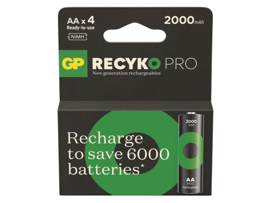 chemické složení: NiMH|hmotnost: 30 g|kapacita: 2 000 mAh|kategorie/řada: ReCyko Pro|max. skladovatelnost: neuvádí se|možnost nabíjení: ano|napětí: 1,2 V|počet nabíjecích cyklů: více než 1 500|prodejní obal: 4 ks, papírová krabička|provozní teplota: -20 °C až +50 °C|rozměr: 14,5 × 50,5 mm|typ: HR6 (tužka, AA)|velikost baterie: AA|značka: GPDoplňkové parametry