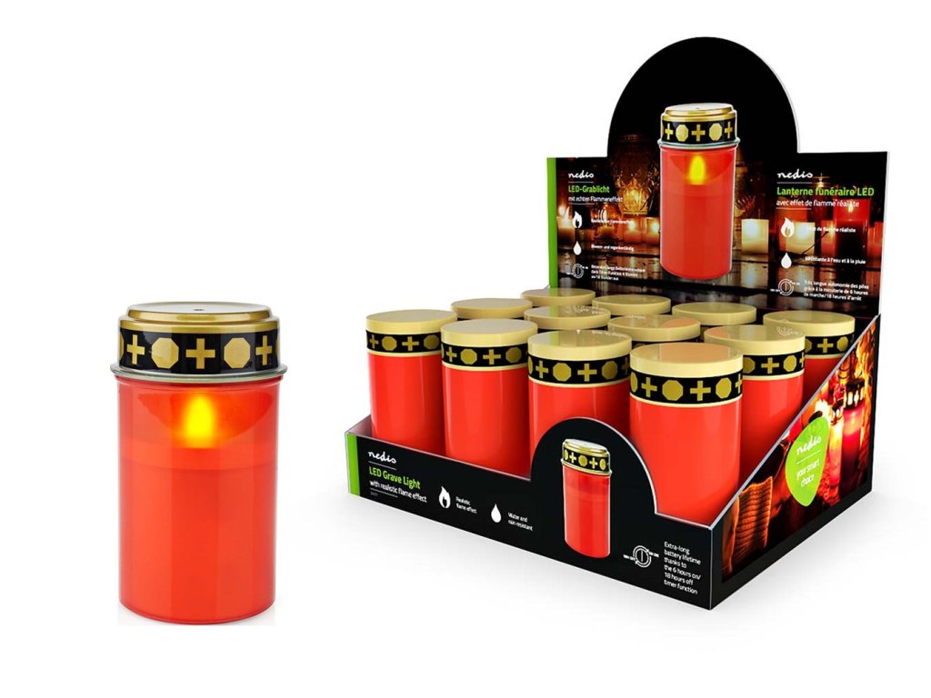 (BAL:1/12/96ks) LED hřbitovní svíčka s časovačem, napájena bateriemi, plápolající jako pravá svíčka za každého počasí. IP44 - díky tomuto stupni krytí je LED světlo na hrob odolné proti vodě a dešti a lze ho proto použít jak vevnitř, tak venku. Bez nečistot z kapajícího vosku, bez nebezpečí otevřeného ohně. Napájení: 2xAA LR6 (nejsou součástí). Výdrž až 45 dní. Rozměr 7 × 12,3 cm.Režimy: OFF – vypnutíON TIMER – po zapnutí svítí v opakovaných cyklechdenně po dobu 6 hodin, potom se na 18 hodin vypne.Doplňkové parametry