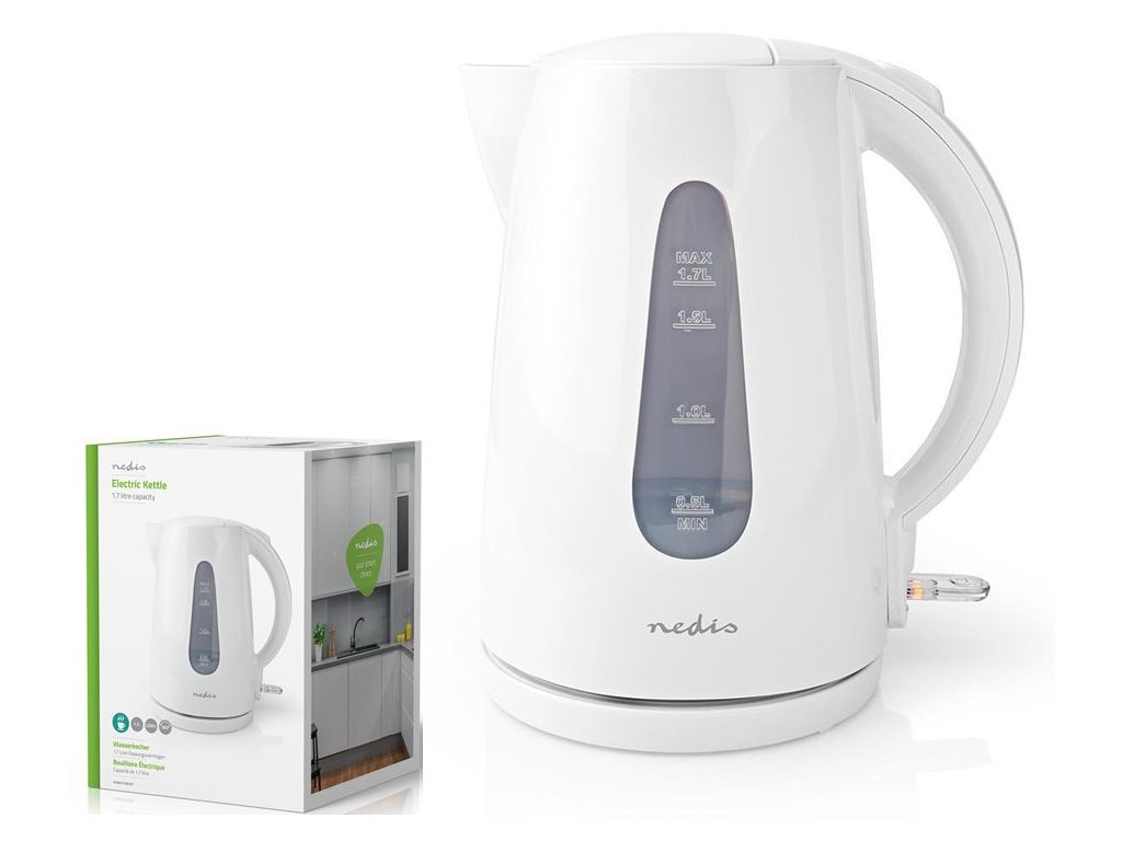 (BAL:1/6) Rychlovarná konvice 1,7l. Otáčení o 360°.Objem 1,7 l - ideální pro žíznivé návštěvy.Navíječ šňůry - pro snadné skladování.Bezdrátová základna otočná o 360 stupňů pro snadnější manipulaci.Ochrana před vařením bez vody - zajistí, aby se konvice, v níž není dostatek vody, nezapnula.Ukazatel hladiny vody se stupnicí.Filtr pro odlučování sedimentů.Vyrobeno z plastu.Napájení 220-240V, 50-60Hz.Příkon: 1850-2200W.Délka kabelu: 0,7m.Barva: bílá.Balení: papírová krabice.Doplňkové parametry