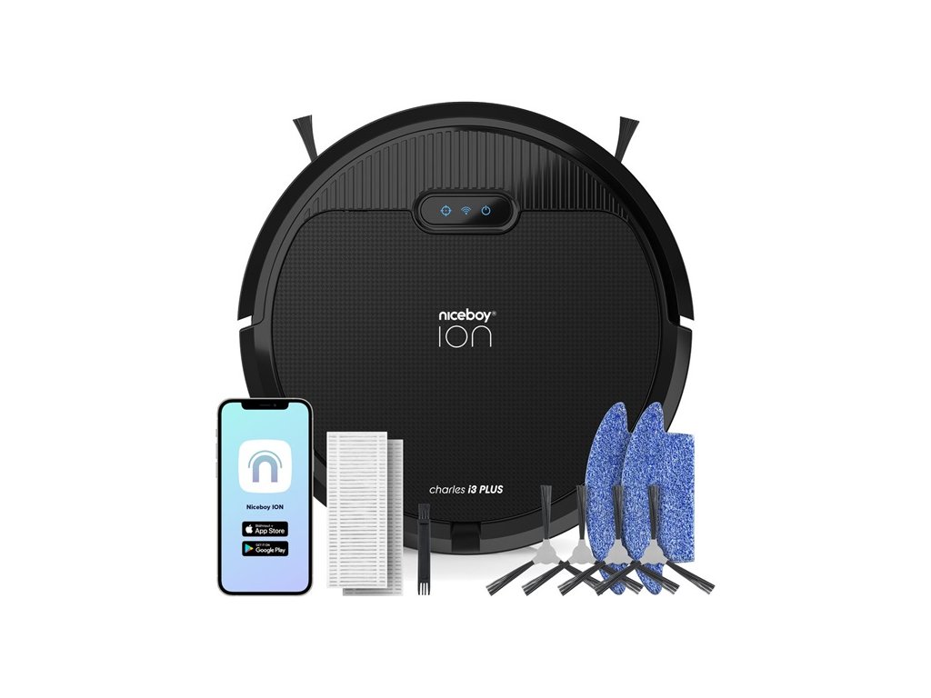 Robotický vysavač Niceboy ION Charles i3 Plus s mopováním a technologií Hurricane PRO má sací výkon 2300 Pa. Gyroskopická navigace, antikolizní senzory a filtrační systém MAX Clean zajistí efektivní a bezpečný úklid s účinností 99,97 %.Doplňkové parametry