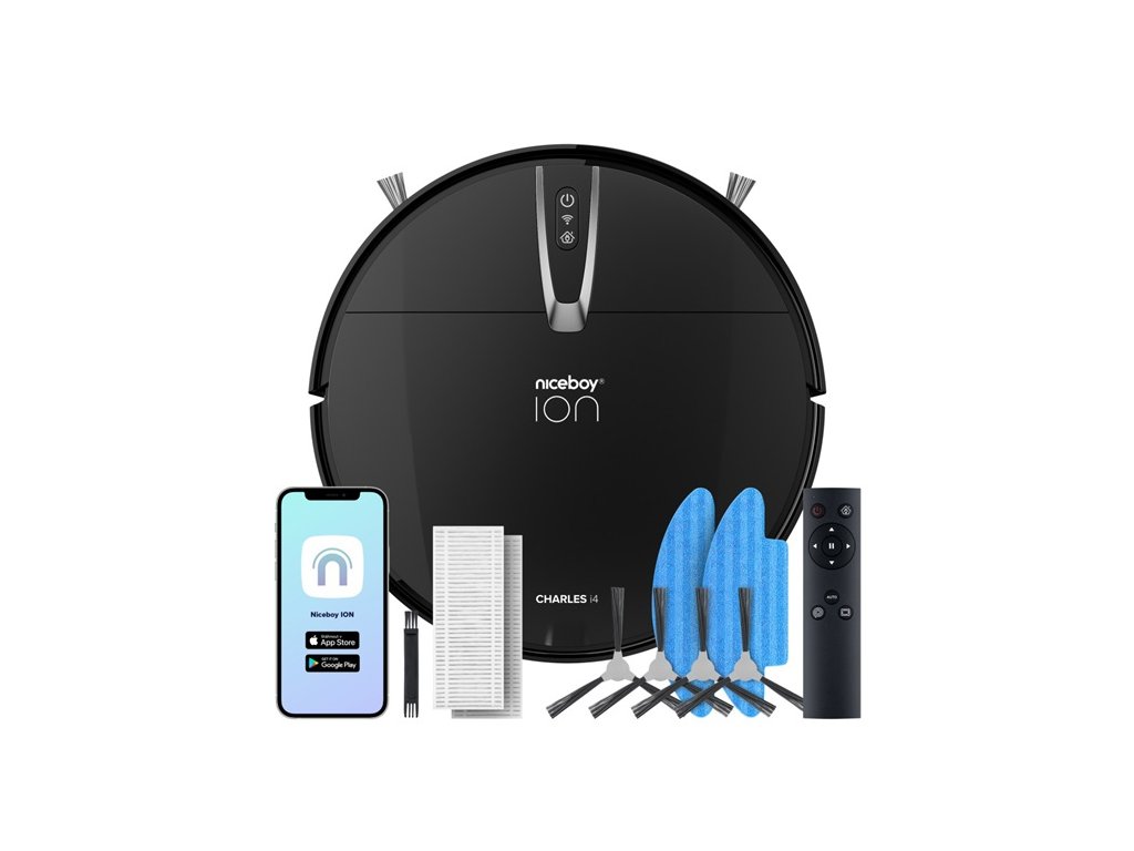 Robotický vysavač s funkcí vysávání i mopováníOvládání pomocí mobilní aplikace Niceboy ION, Na všechny typy tvrdých podlah a nízkých koberců, Vysoký sací výkon 2000 Pa, HEPA filtr, Podpora hlasových asistentů, Kapacita baterie 100 min, prachová nádoba 600 ml, nádoba na vodu 180 ml,hlučnost 65 dBDoplňkové parametry