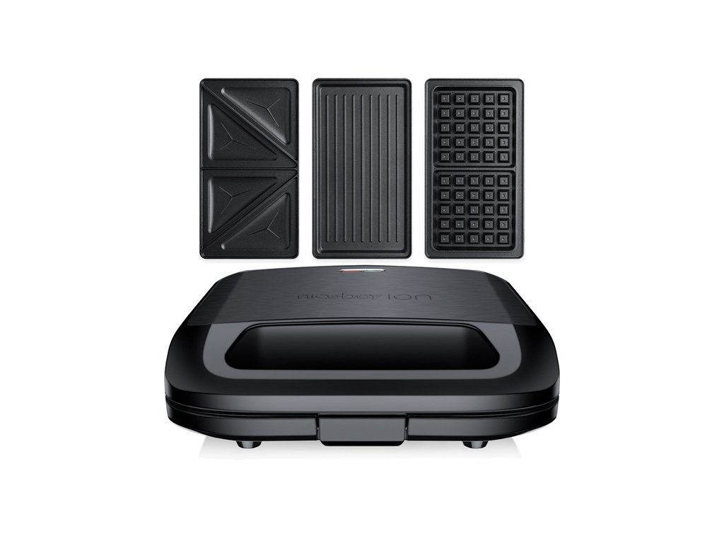 Toastovač, Příkon 750 W, Trojúhelníkový tvar plotýnek, Plotýnky v balení Grilovací/panini, Sendvičová, Vaflová, Vyjímatelné plotny, Nepřilnavý povrch, Typ 3v1, Funkce: Tepelně izolovaná rukojeť, Systém uložení šňůry, Protiskluzové nožky, Ochrana proti přehřátí, Uzamykání, Světelná kontrolkaDoplňkové parametry