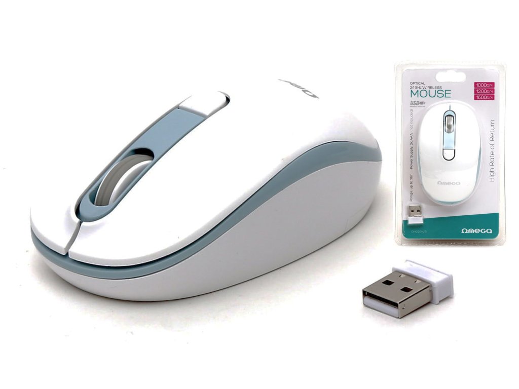 Bezdrátová optická myš. Univerzální použití, pro desktop i notebook. Ergonomie pro praváky i leváky.Citlivost: 1000/1200/1600 DPI. Provozní dosah: až 10 metrů. Napájení: 2 baterie AAA (nejsou součástí balení). Přijímač: USB nano. Počet tlačítek: 4. Rolovací kolečko.On/Off vypínač.Kompatibilní s: Windows XP / Vista / 7/8/10/11 / MAC. Rozměry: 105,4 x 68,4 x 37,6 mm. Barva: bílo-modrá. Balení: blistr se závěsem.Doplňkové parametry
