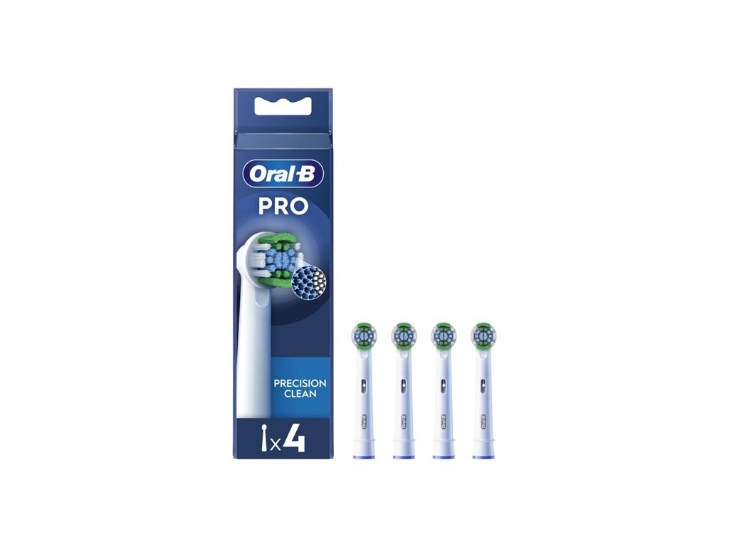 Kartáčková hlava Oral-B Pro Precision Clean odstraňuje zubní plak, a umožňuje tak v porovnání s běžným manuálním zubním kartáčkem špičkové čištění jednoho zubu po druhém. Originální kartáčkové hlavy Oral-B jsou navrženy s novými vlákny ve tvaru X, která čistí v místech, kam kulaté hlavy nedosáhnou. Ukazatel opotřebení kartáčkové hlavy změní vlákna ze zelené barvy na žlutou a ukazuje tak, kdy je hlavu nutné vyměnit pro 100% účinnost čištění. Zaručená kompatibilita se všemi dobíjecími zubními kartáčky Oral-B, s výjimkou zubních kartáčků Pulsonic a iO. 4 ks hlavic v balení.Doplňkové parametry