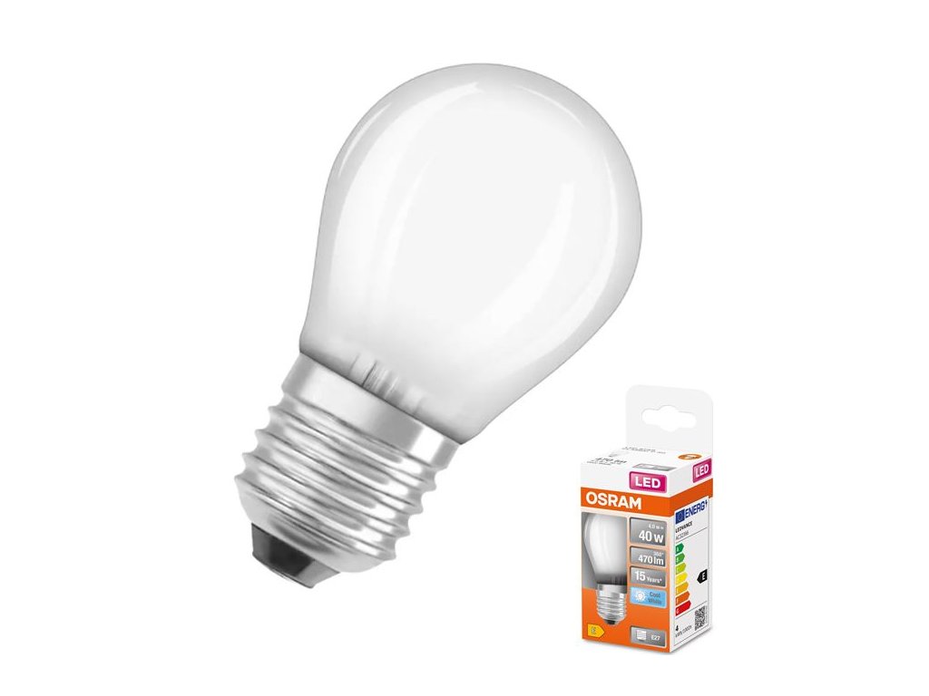 (BAL:1/6ks) LED žárovka OSRAM LED STAR, tvar MINIGLOBE , 4W (náhrada za 40W), E27, 220-240V, studené bílé světlo 4000K, svítivost: 470lm, úhel vyzařování 360°, E, Rozměr: 77x45mm. Jmenovitá životnost 15000 h. Počet spínacích cyklů 100000.Doplňkové parametry