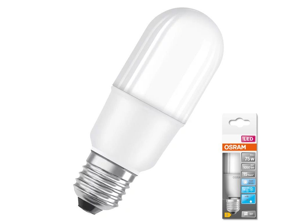 (BAL:1/6ks) LED žárovka OSRAM LED STAR, tvar CLASSIC STICK 75 , 9W (náhrada za 75W), E27, 220-240V, studené bílé světlo 4000K, svítivost: 1050lm, úhel vyzařování 200°, E,Svítí kolem dokola 360°Rozměr: 116x38mm. Jmenovitá životnost 15000 h. Počet spínacích cyklů 100000. Lze použít v teplotách od -40° do +40°Doplňkové parametry