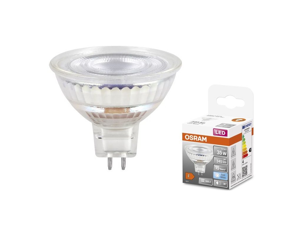 (BAL:1/6ks) LED žárovka OSRAM LED STAR.MR16, 3,8W (náhrada za 35W), Patice: GU5,3. 12V, 15000hod, Teplota chromatičnosti: studené bílé světlo 4000K, 345lm, 700cd, Vyzařovací úhel: 36°. provozní teplota -20 - 40°C. Rozměr: 50x44mm, Energetická třída: F.Balení: papírová krabička se závěsem.Doplňkové parametry