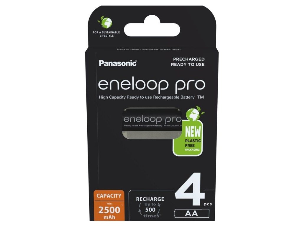 (BAL:4/80ks) Cena je uvedena za jeden kus. V balení na blistru 4ks.Dobíjecí baterie Panasonic Eneloop PRO EKO AA jsou ideální pro napájení energeticky náročných zařízení, jako jsou blesky fotoaparátů, bezdrátové klávesnice a myši, herní ovladače, rádiem ovládané hračky a různé domácí spotřebiče.Technická specifikace Panasonic Eneloop PRO EKO AANikl-metalhydridová baterieMinimální kapacita: 2 500 mAhNapětí: 1,2 VPrůměr: 14,5 mmUchovává 85 % energie 12 měsíců po nabitíFunguje při nízkých teplotách až do -20 °CBalení: 4 ksDoplňkové parametry