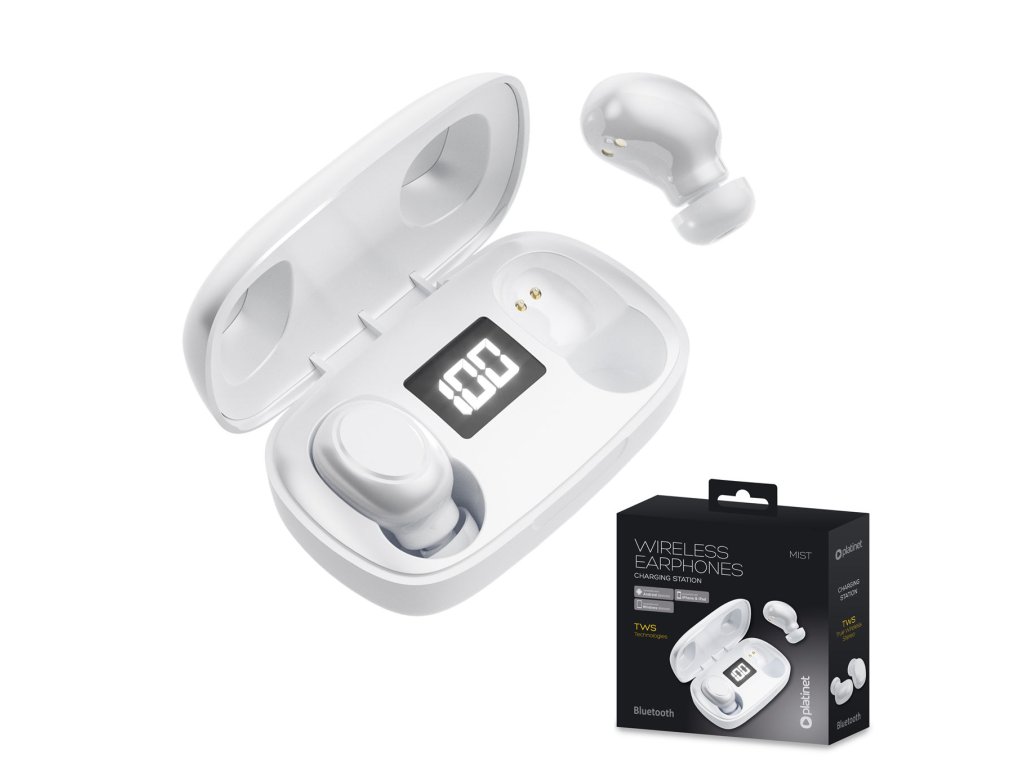Bezdrátová Bluetooth TWS sluchátka Platinet s powerbank pouzdrem.Sluchátka disponují vestavěným mikrofonem pro telefonování.Power bank pouzro s číselnou indikací kapacity.Ovládání poklepáním na sluchátka. Specifikace:Bluetooth verze: 5.0 .Baterie v sluchátku: 2x30 mAh. Baterie v pouzdru: 250 mAh.Výdrž sluchátka: až 4 hodiny. Rozměr pouzdra: 65 x 28 x 40 mm. Podporované profily: HFP, A2DP, AVRCP, HSP. Frekvenční rozsah: 20 Hz - 20 KHz. Citlivost: 100 db +- 5 db.Výkon: 3mW.Barva: bíláSoučástí balení: dobíjecí powerbank krabička, microUSB kabel, 3 velikosti silikonových náušníků.Balení: papírová krabička se závěsem.Doplňkové parametry