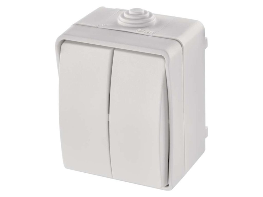 barva: bílá|design: neuvádí se|krytí: IP54|napětí: 250 V~/10 AX|prodejní obal: 1 ks, PE sáček|produkt: spínač sériový č. 5 (lustrový)|provedení: 2 tlač. klasický voděodolný|způsob montáže: na stěnuDoplňkové parametry