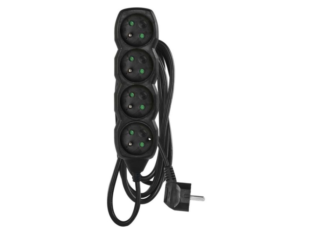 barva: černá|délka: 3 m|dětské clonky: ano|krytí: IP20|materiál zásuvky a vidlice: plast|max. zátěž: 2 300 W|napětí: 250 V~|počet zásuvek: 4|prodejní obal: 1 ks, závěs|proud: 10 A max.|průřez vodiče: 1,0 mm²|typ izolace: PVC|USB výstup: ne|vodič: H05VV-F3G|vypínač: neDoplňkové parametry