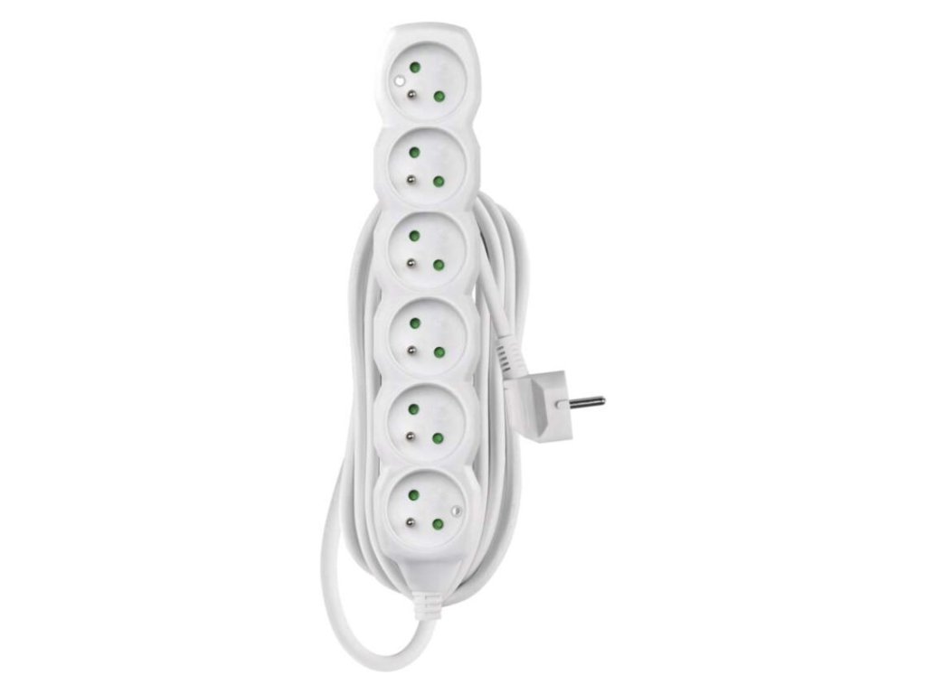 barva: bílá|délka: 5 m|dětské clonky: ano|krytí: IP20|materiál zásuvky a vidlice: plast|max. zátěž: 3 680 W|napětí: 250 V~|počet zásuvek: 6|prodejní obal: 1 ks, závěs|proud: 16 A max.|průřez vodiče: 1,5 mm²|typ izolace: PVC|USB výstup: ne|vodič: H05VV-F3G|vypínač: neDoplňkové parametry