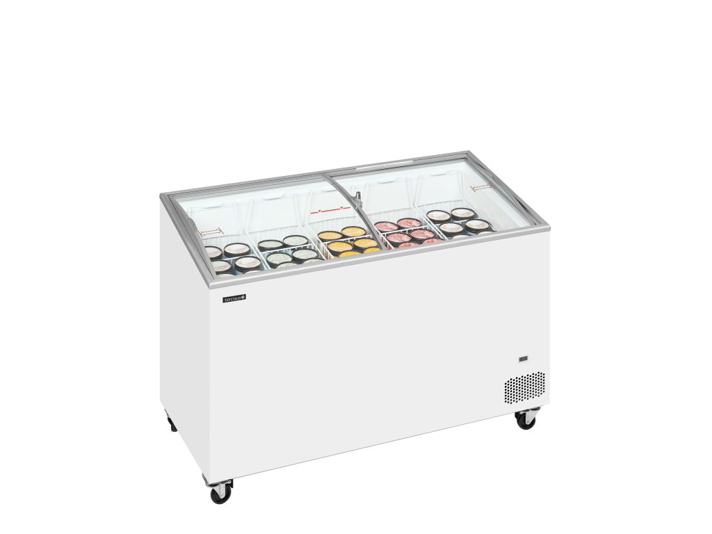 Standardní řada pultových mrazniček IC-SCEB nabízí stabilní a spolehlivě konstruované zařízení za příznivou cenu. Je skvělou volbou pro začínající podniky, sezónní prodej apod. Dodává se s oblými prosklenými posuvnými víky pro lepší viditelnost produktů a s kompletní sadou košů (kromě nejmenšího modelu), připravených k naplnění lahodnou zmrzlinou. Za účelem snadné manipulace je mraznička vybavena robustními kolečky pro vysokou zátěž.Doplňkové parametry