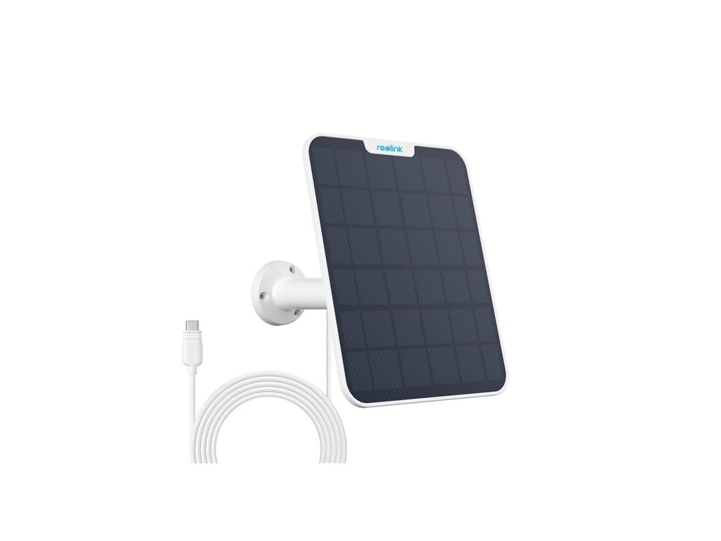 Solární panel 2, bílý, kompatibilní se všemi bateriovými kamerami značky Reolink, maximální nabíjecí výkon 6 W, maximální nabíjecí proud 960 mA, provozní účinnost 19,5 %, stupeň krytí IP65, konektor na panelu: USB-C, nástěnná konzole s možností otáčení 360°, součástí balení: 4 m nápájecí kabel.Doplňkové parametry