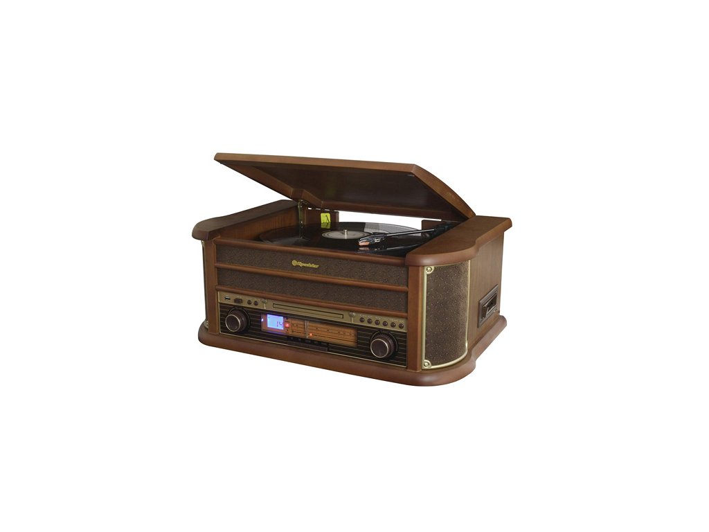 retro, dřevěné provedení,Bluetooth, stereo,CD/MP3 přehrávač,přední podavač CD, gramofon; 33/45/78 otáček, kazetový přehrávač s autostopem, 2 vestavěné reproduktory, LCD displej,AM/FM analog rádio, funkce kopírování z gramofonu,kazety na formát MP3 na USB,dálk. ovladač,výkon 40W PMPO, 2x 2,5W RMSDoplňkové parametry
