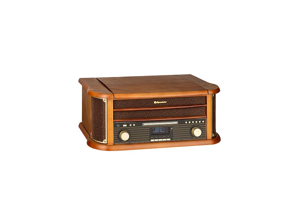 retro, dřevěné provedení, gramofon 35/45/75, CD/MP3 přehrávač, LED displej, funkce kopírování z gramofonu kazety na formát MP3 na USB, kazetový přehrávač s autostopem, 2 vestavěné reproduktory, 2x 5W RMS, tuner (radio) digitální ladění DAB/DAB+/FM, Stereo, RDS, výkon 80W PMPODoplňkové parametry