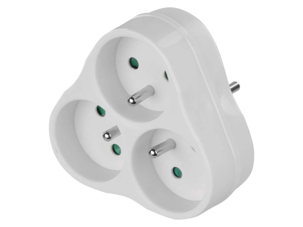 barva: bílá|dálkový ovladač: ne|dětské clonky: ano|dosah signálu: neuvádí se|easy learning: ne|krytí: IP20|materiál: plast|max. zátěž: 2 300 W|možnost ovládání: ne|napětí/proud: 250 V~/10 A max.|počet pólů: neuvádí se|počet zásuvek: 3× 2P + PE|pozice ochranného kontaktu: neuvádí se|přenosoná frekvence: ne|prodejní obal: 1 ks, závěs|produkt: rozbočovací zásuvka 3×|typ: FRENCH|venkovní použití: ne|vypínač: neDoplňkové parametry