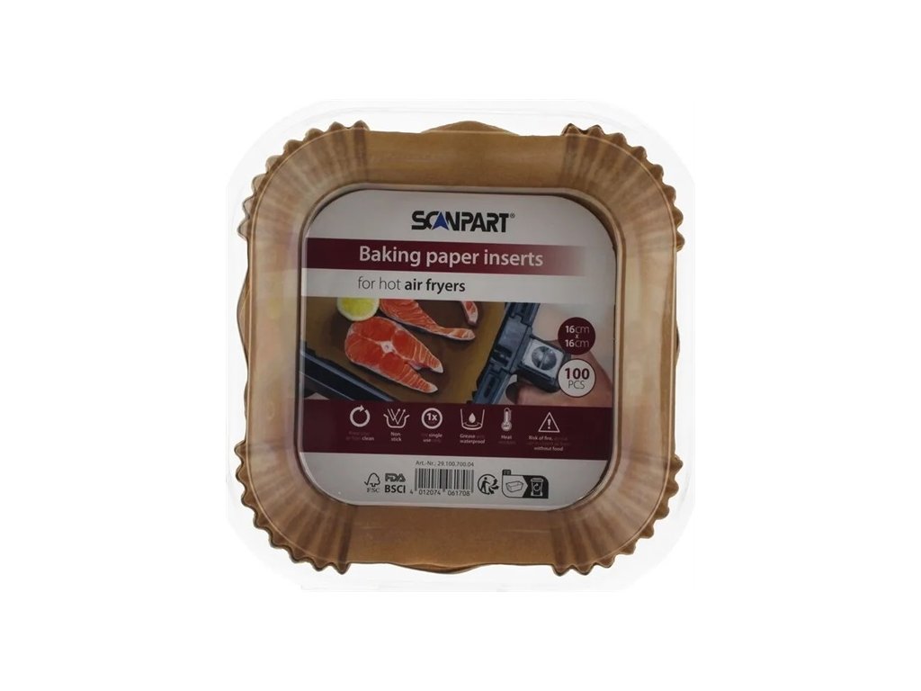 Pečicí papír do teplovzdušné fritézy. Jednorázový. Udržuje fritézu čistou. Nenasákavý. Odolný vůči teplotám do 120 °C. Balení 100 ksVelikost: průměr 16 cmDoplňkové parametry