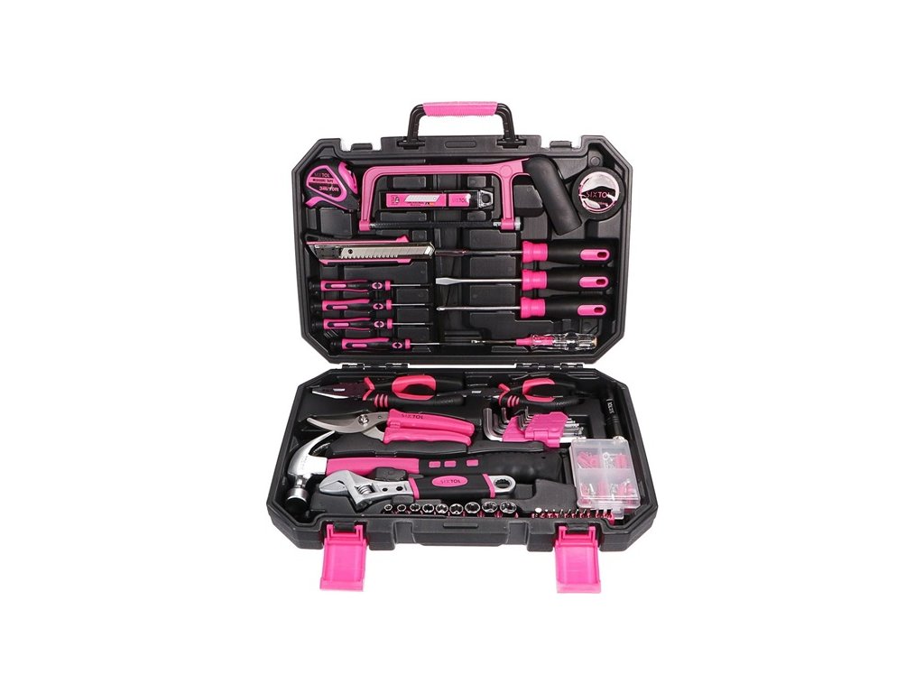Sada nářadí HOME PINK 128 SIXTOL; Sada nářadí SIXTOL HOME PINK 128 se skládá z nářadí jako jsou kleště, imbusové klíče, kladivo, šroubováky, zahradnické nůžky, nástrčné hlavice, svítilna a další. Součástí je i množství užitečného spojovacího materiálu; v černo-růžovém kufříkuDoplňkové parametry