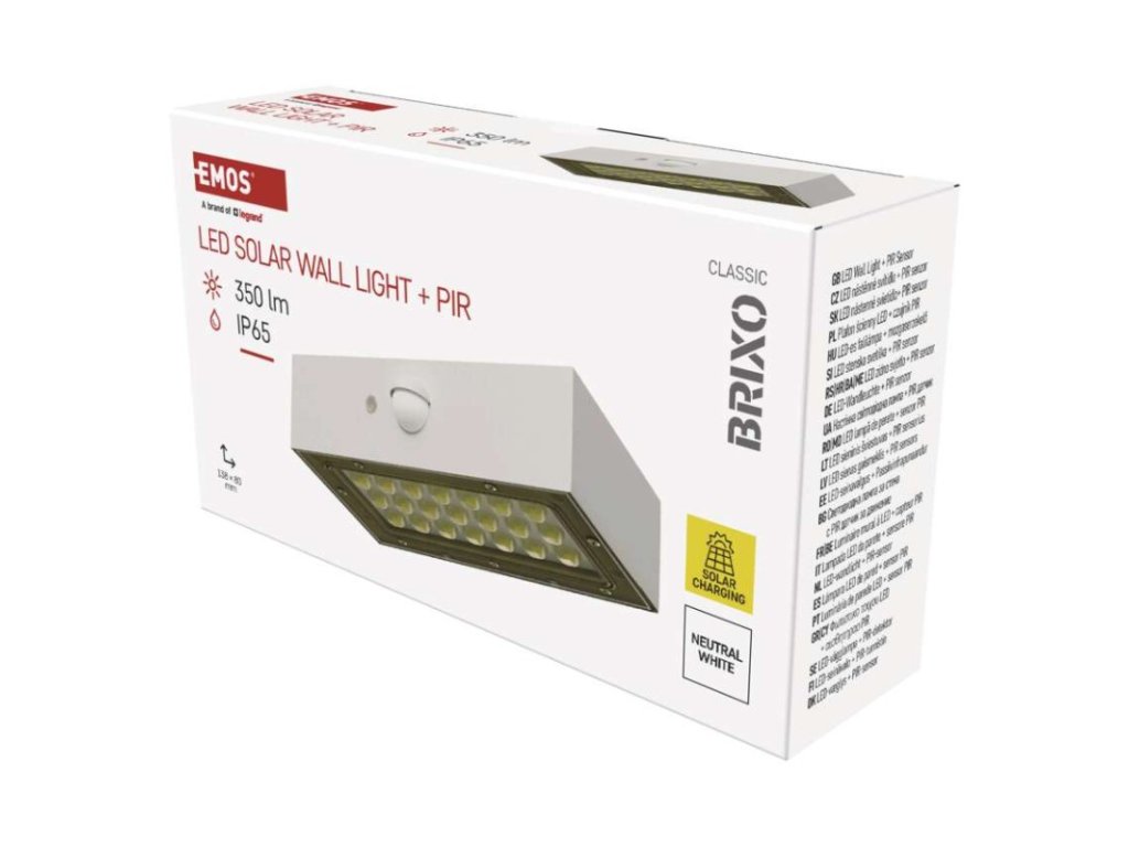 akumulátor: Li-Ion 1 200 mAh|barva: bílá|barva světla: neutrální bílá|délka přívodního kabelu: neuvádí se|doba svícení na AKU: 35 hodin|dosah PIR senzoru: 6 m|energetická třída použitého světelného zdroje: neuvádí se|flicker-free: nebliká|frekvence: neuvádí se|index podání barev (CRI): Ra > 80|kategorie: CLASSIC|krytí: IP65|materiál difuzoru: plast (PC)|materiál přívodního kabelu: neuvádí se|materiál těla: plast (ABS+PC)|napájení: solární|napětí: 3,7 V|PIR senzor: ano|počet průchozích zásuvek: neuvádí se|použití: povrchová montáž|příkon: –|prodejní obal: 1 ks, krabice|proud: neuvádí se|řada: neuvádí se|rozměr: 138 × 90 × 35 mm|rozsah pracovní teploty: -20 °C až +50 °C|stmívání: neuvádí se|stupeň ochrany proti mechanickým nárazům: neuvádí se|světelná účinnost: neuvádí se|světelný tok: 350 lm|teplota chromatičnosti: 4 000 K|typ přívodního kabelu: neuvádí se|typ průchozích zásuvek: neuvádí se|typ stmívání: –|účiník: neuvádí se|úhel vyzařování: 140° × 70°|záruční doba: 2 roky|zdroj světla: LED|životnost: neuvádí se|zkušební žárovka součástí balení: neuvádí seDoplňkové parametry