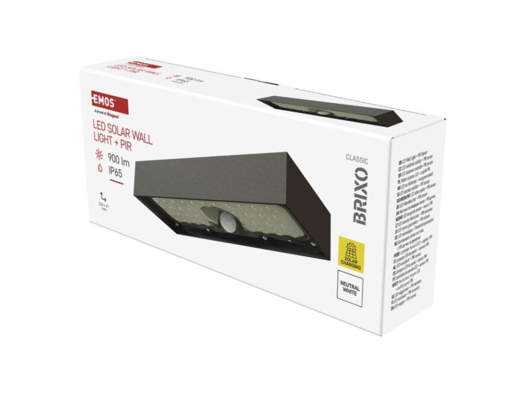 akumulátor: Li-Ion 3 000 mAh|barva: černá|barva světla: neutrální bílá|délka přívodního kabelu: neuvádí se|doba svícení na AKU: 35 hodin|dosah PIR senzoru: 7 m|energetická třída použitého světelného zdroje: neuvádí se|flicker-free: nebliká|frekvence: neuvádí se|index podání barev (CRI): Ra > 80|kategorie: CLASSIC|krytí: IP65|materiál difuzoru: plast (PC)|materiál přívodního kabelu: neuvádí se|materiál těla: plast (ABS+PC)|napájení: solární|napětí: 3,7 V|PIR senzor: ano|počet průchozích zásuvek: neuvádí se|použití: povrchová montáž|příkon: –|prodejní obal: 1 ks, krabice|proud: neuvádí se|řada: neuvádí se|rozměr: 230 × 97 × 43 mm|rozsah pracovní teploty: -20 °C až +50 °C|stmívání: neuvádí se|stupeň ochrany proti mechanickým nárazům: neuvádí se|světelná účinnost: neuvádí se|světelný tok: 900 lm|teplota chromatičnosti: 4 000 K|typ přívodního kabelu: neuvádí se|typ průchozích zásuvek: neuvádí se|typ stmívání: –|účiník: neuvádí se|úhel vyzařování: 140° × 70°|záruční doba: 2 roky|zdroj světla: LED|životnost: neuvádí se|zkušební žárovka součástí balení: neuvádí seDoplňkové parametry