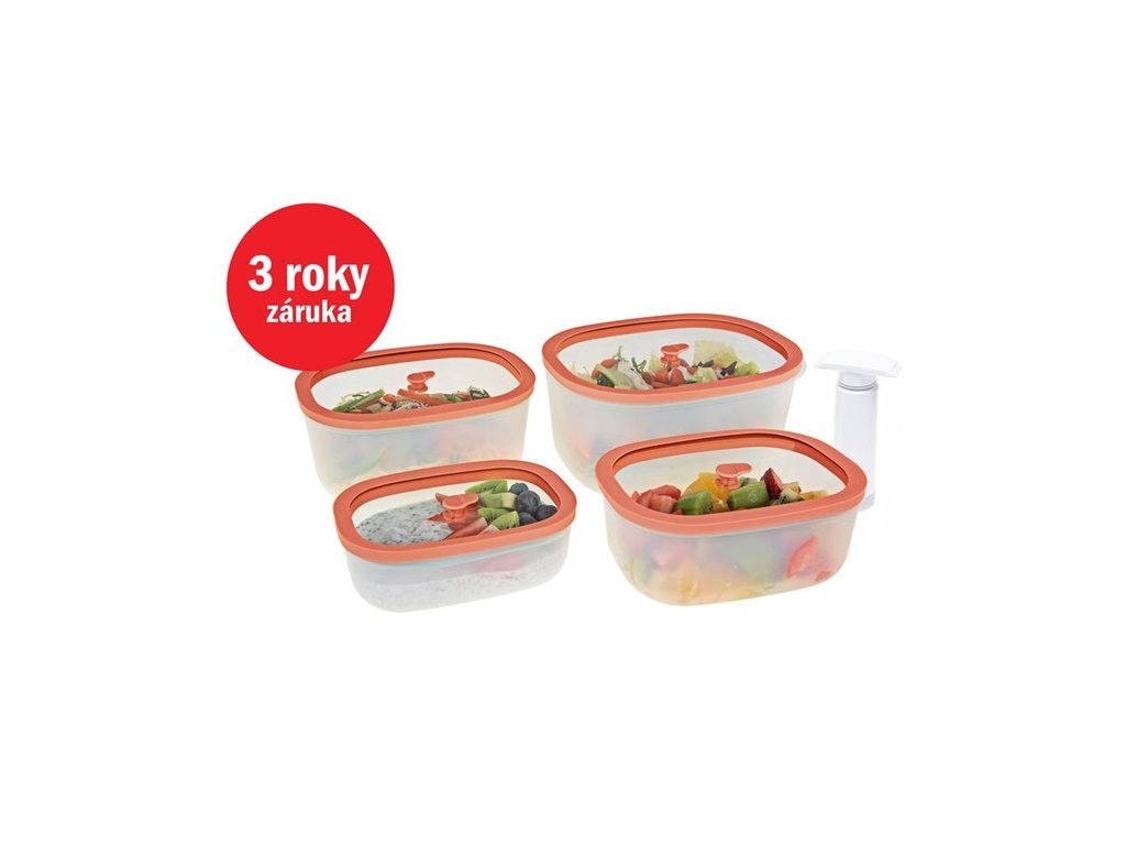Vakuové dózy: 0,5; 0,9; 1,4 a 2,3 l + ruční pumpa, dvoustupňová ochrana uzavření, dózy z pevného a odolného BPA free plastu a skleněné víko, vhodné do myčky nádobí, mrazničky i mikrovlnkyDoplňkové parametry