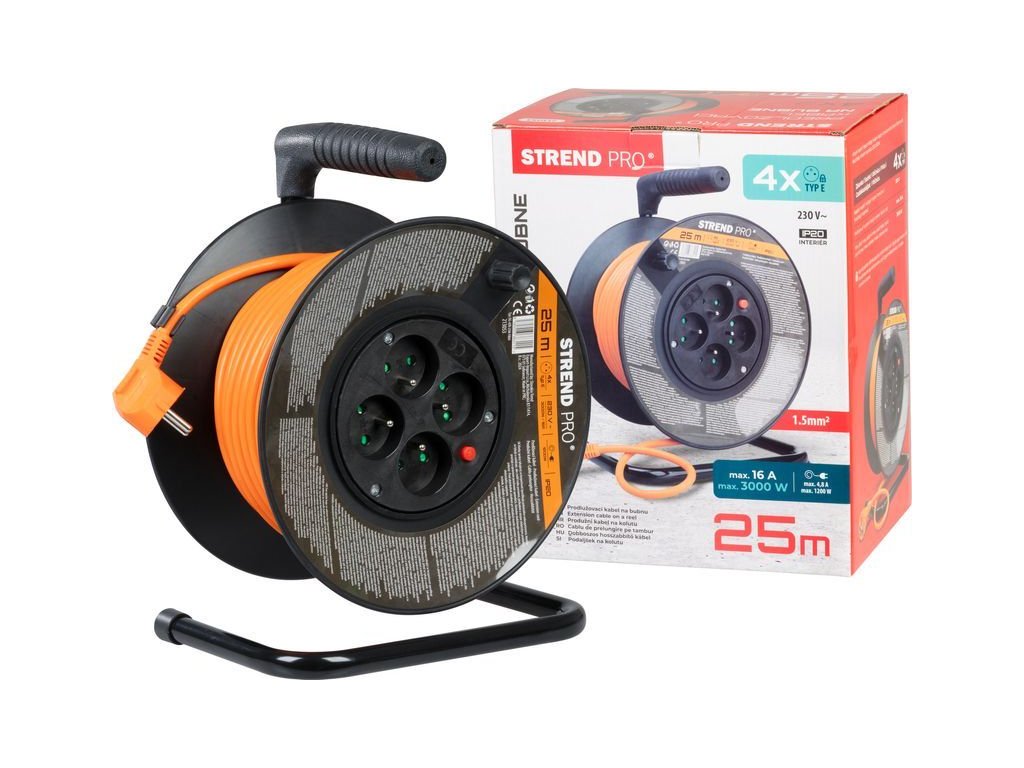 (BAL:1ks) Prodlužovací kabel na bubnu o délce 25 metrů.4xzas.Tepelná pojistka.Max. 230V 16A / 3000W. Vodič DG-FB04, H05VV-F 3x1,5mm.IP20.Barva: oranžová. Balení: papírová krabice.Doplňkové parametry