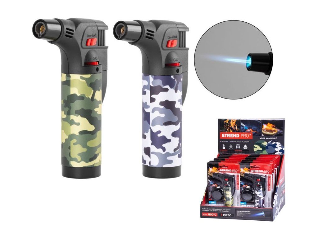 (BAL:1/12ks) Zapaovač Strend Pro v pěkném kamuflážovom designu v kompaktných rozměrech. Zapalovač je možné použiť kdekoli potřebujete, má tryskový plamen, regulátor plamene a je plnitelný. Můžete ho použit i jako šikovný mini hořák. Rozměry: 75x45x120 mm. Výkon: 0,5 kWSpotřeba plynu: 10 g/hMax. teplota: 1100 °CBalení: blistr na pověšeníDoplňkové parametry