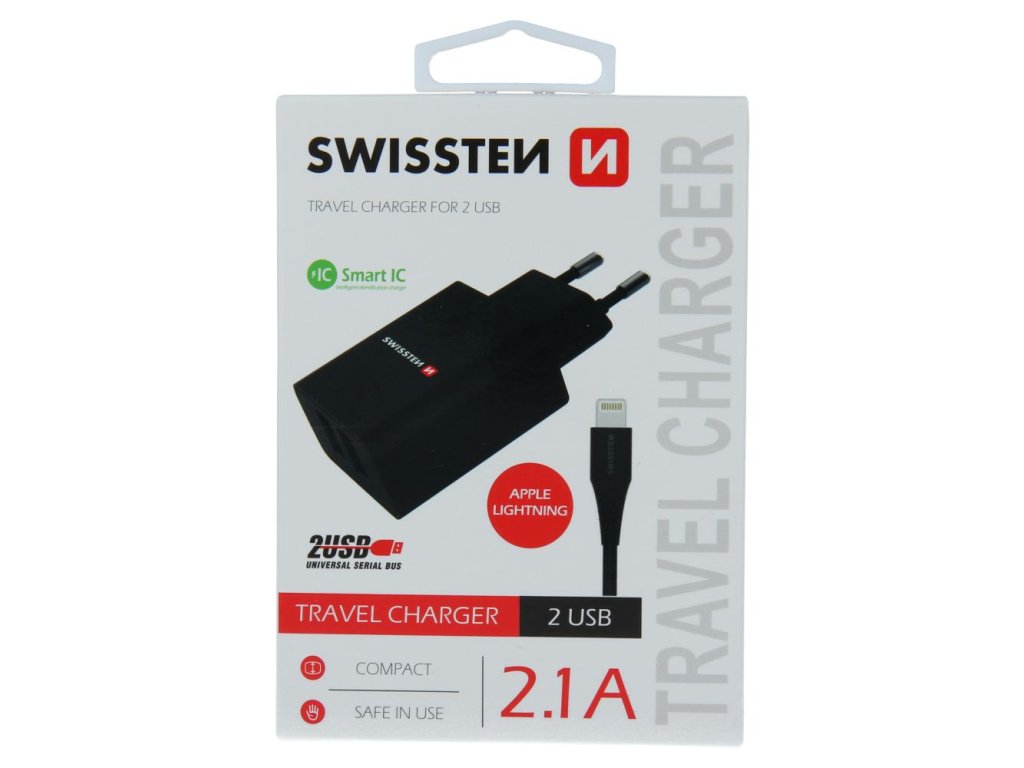 SWISSTEN adaptér 230V/2,1A 2xUSB + lightning kabel 1,2m ČERNÁ