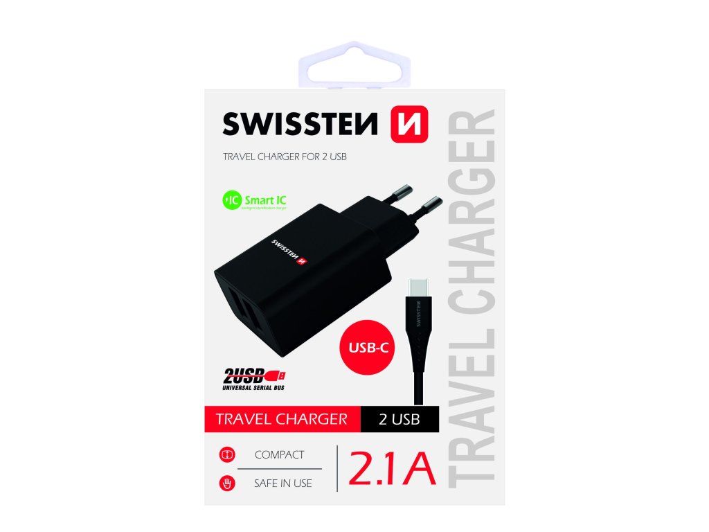 SWISSTEN adaptér 230V/2,1A 2xUSB + USB-C kabel 1,2m ČERNÁ