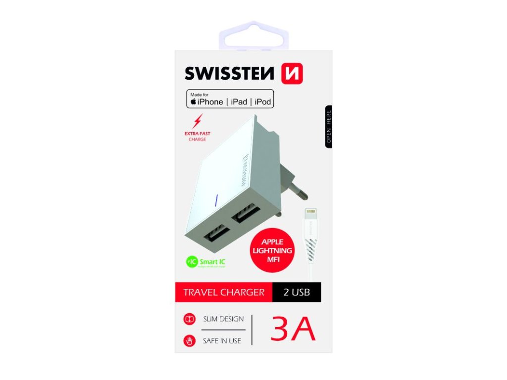 (BAL: 1/100) SPECIFIKACE: vstupní napětí: 100V – 240V, výstupní napětí: 5V, max. výstupní proud: 3A,výkon 15W, délka kabelu 1,2m, Nabíječka je vybavena technologií SMART IC, která zajistí, že nabíječka rozpozná parametry nabíjeného zařízení a přizpůsobí mu odpovídající velikost proudu.A také technologií EXTRA FAST CHARGE pro velmi rychlé nabíjení.Kvalitně zpracovaná síťová nabíječka s MFI certifikovaným kabelem pro Apple lightning z modelové řady SWISSTEN. Díky výstupnímu proudu až 3A můžete dobíjet bez problémů svůj smartphone.Výřez v adaptéru slouží jako stojánek při nabíjení.Doplňkové parametry