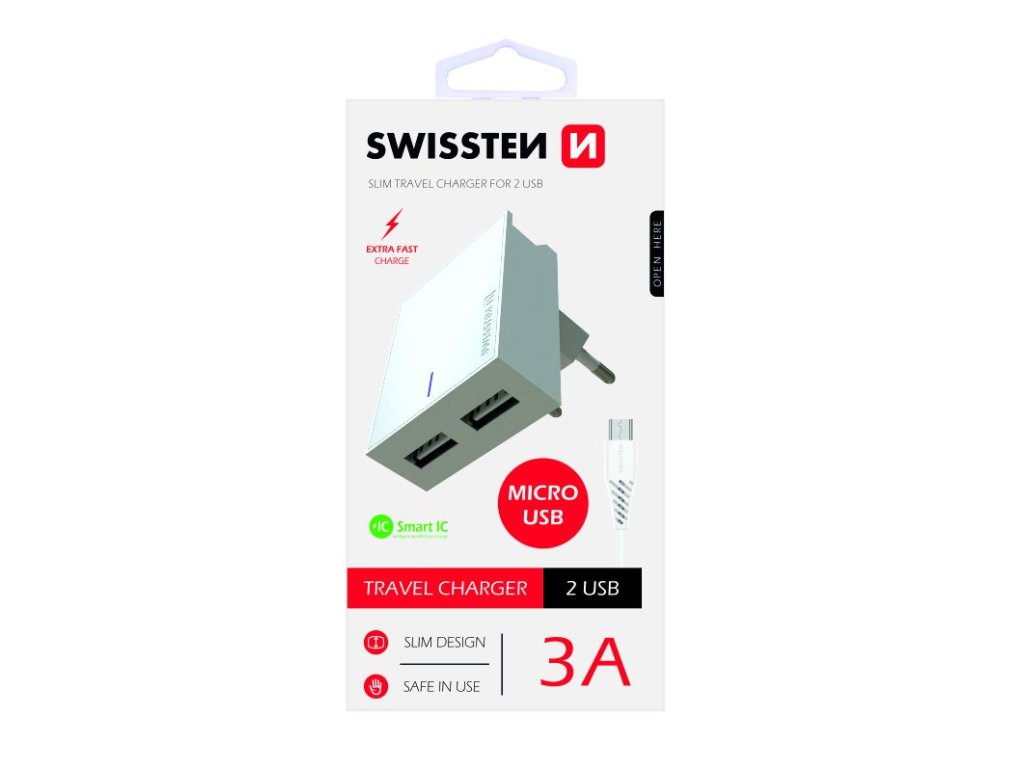 SWISSTEN adaptér 230V/3A 2xUSB + microUSB kabel 1,2m BÍLÁ