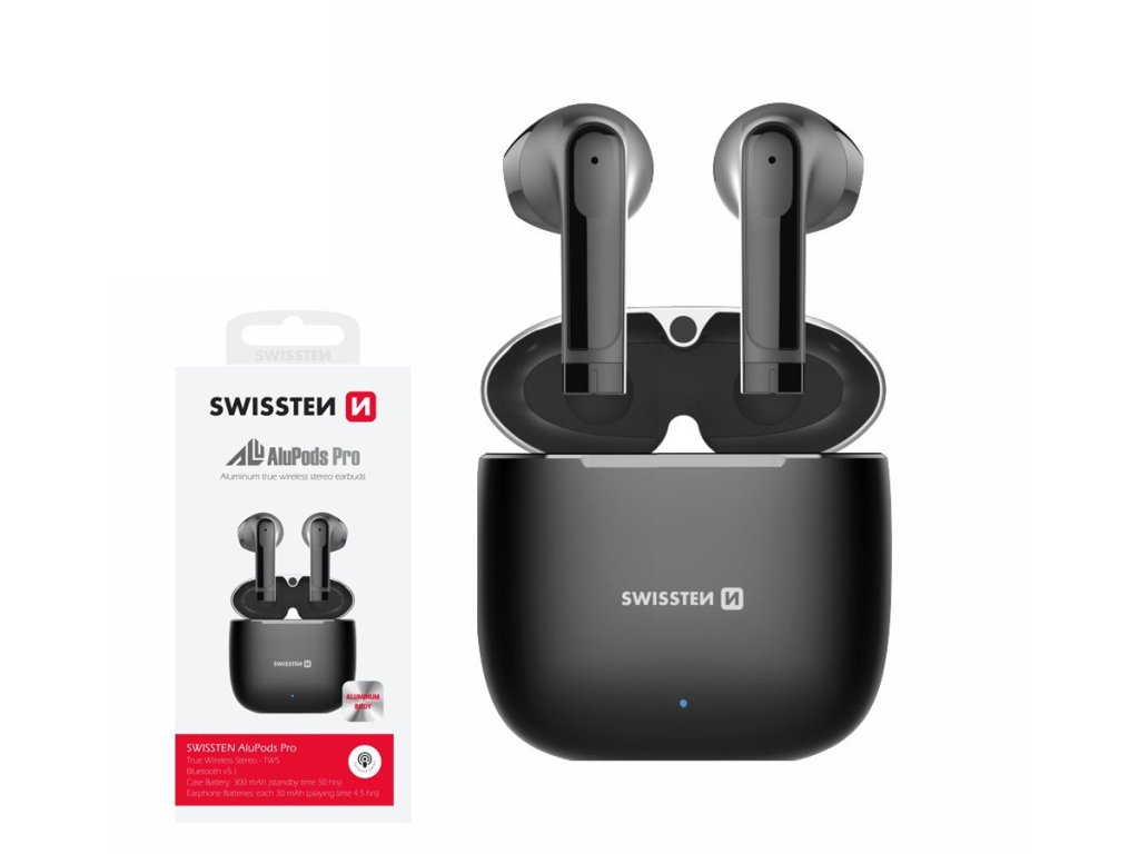 Bluetooth sluchátka SWISSTEN ALUPODS PRO vynikají čistým zvukem a luxusním designem. Ovládání hudby a hovoru je samozřejmostí.Technologie Bluetooth TWS. Sluchátka v provedení plastové "pecky"Elegantní hliník, který je základem při výrobě dobíjecího pouzdra dává produktu nejen luxusní design ale i maximální ochranu proti mechanickému poškození.Sluchátka disponují vestavěným mikrofonem pro telefonování.Sluchátka SWISSTEN ALUPODS PRO disponují kompletním ovládáním hudby jako je STOP/PLAY, ovládání hlasitosti, posun na předchozí nebo následující skladbu.Ovládání poklepáním na sluchátka. Specifikace:Bluetooth verze: 5.1 .Dosah: až 10m.Baterie ve sluchátku: 2x30 mAh. Baterie v pouzdru: 300 mAh.Pohotovostní doba pouzdra 50hodinVýdrž sluchátka: 4,5 hodiny. Váha sluchátka: 4g. Váha pouzdra: 59g. Rozměr pouzdra: 49,5x49,5x21,3mmČas nabíjení: 2,5hod. Barva: černá.Součástí balení: dobíjecí powerbank krabička, USB-C kabel.Balení: papírová krabička se závěsem.Doplňkové parametry