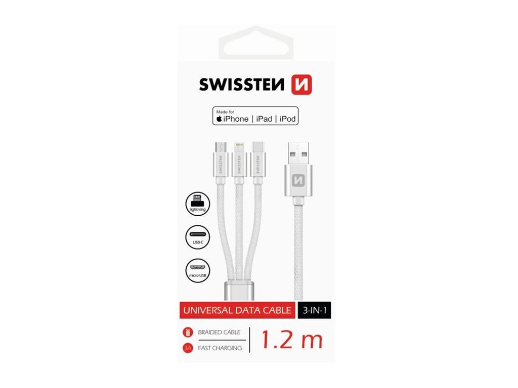 SWISSTEN kabel USB 3v1 microUSB USB-C Lightning MFI 1,2m stříbrná