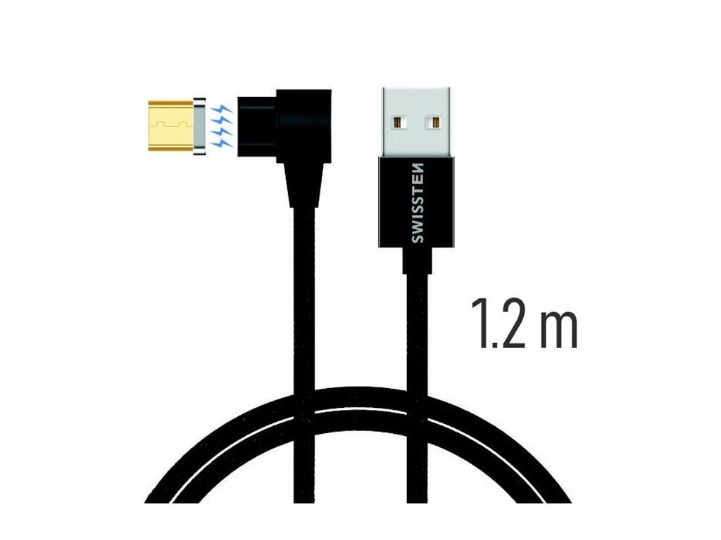 SWISSTEN kabel USB microUSB magnetický textilní úhlový 1,2m 3A černá
