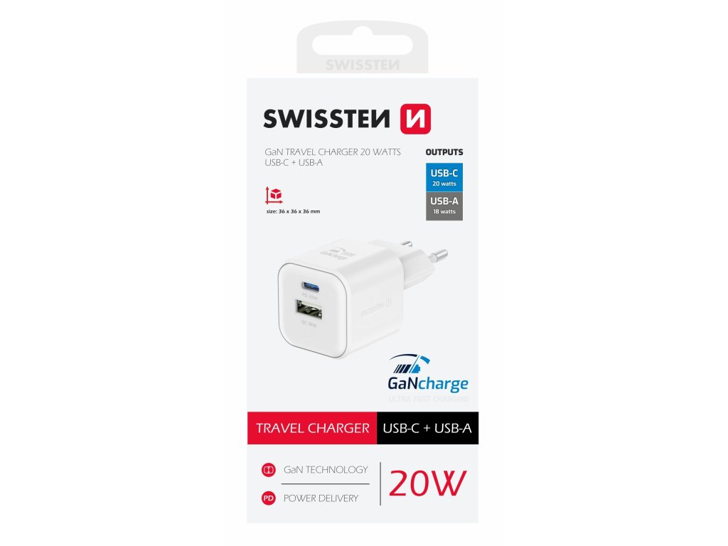 SWISSTEN mini adaptér GaN 230V 20W POWER DELIVERY 1xUSB-C + 1xUSB QC 18W BÍLÁ