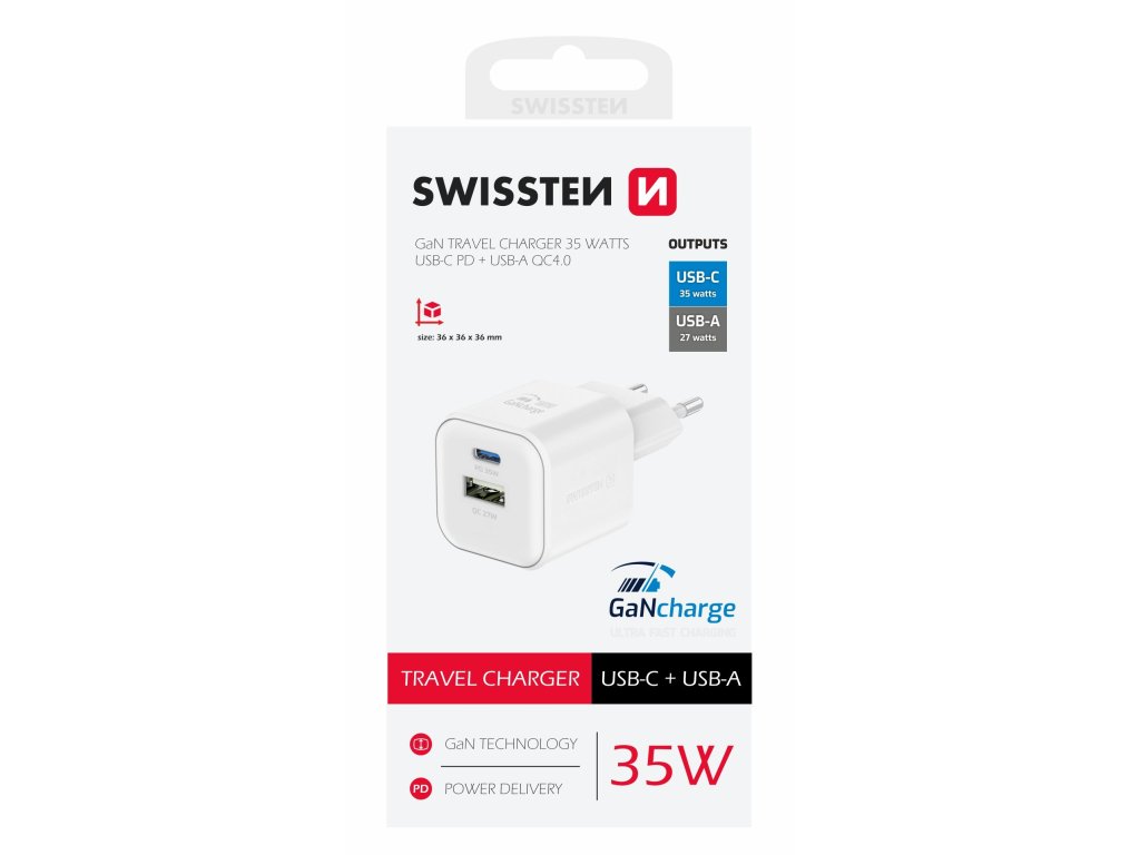 SWISSTEN mini adaptér GaN 230V 35W POWER DELIVERY 1xUSB-C + 1xUSB QC 27W BÍLÁ
