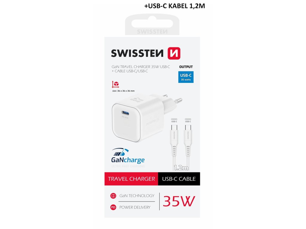SWISSTEN mini adaptér GaN 230V 35W POWER DELIVERY 1xUSB-C + USB-C kabel 1,2m BÍLÁ