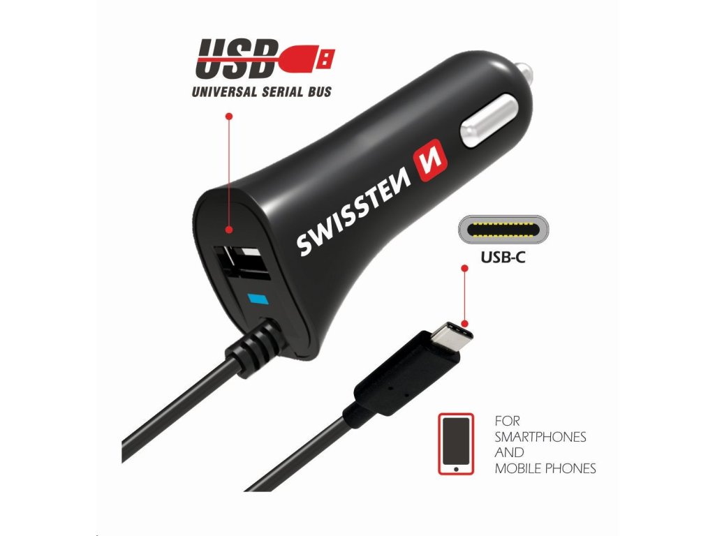 SWISSTEN nabíječ 2v1 1xUSB 1x kabel USB-C 12V/2,4A ČERNÁ