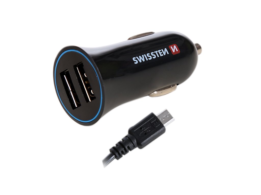SWISSTEN nabíječ 2xUSB 12V/2,4A ČERNÁ + micro USB kabel
