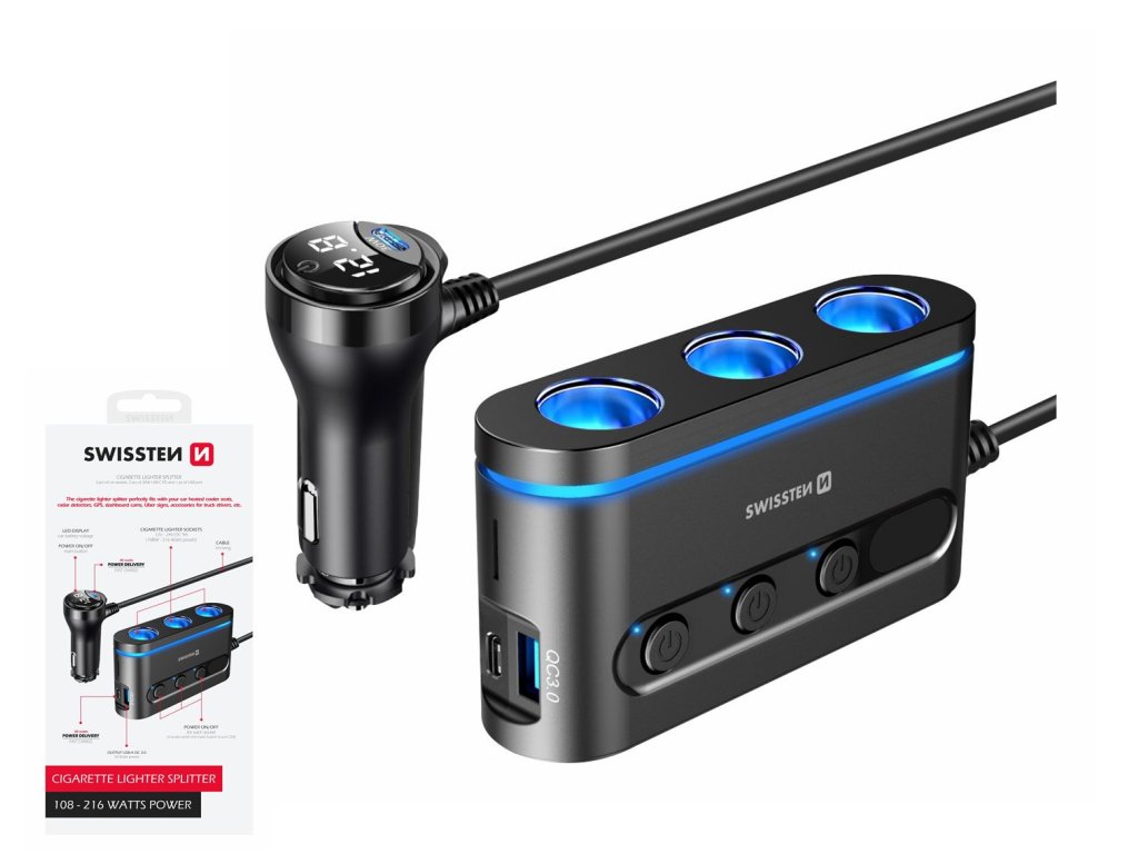 CL splitter má 3x výstup pro CL adaptér, 2x USB-C PD PPS, 1x USB-A QC 3.0 a celkový výkon 108-216W. Indikace napětí palubního akumulátoru.On/Off - Každá CL zásuvka ovladatelná zvlášť.Díky CL rozbočovači můžete používat hned tři zařízení (autochladnička, antiradar, kamera atd.) najednou. Všechny tři CL konektory mají dohromady vysoký výstupní výkon 108-216W.2 výstupy USB-C. Oba dobíjecí porty USB-C disponují technologií rychlého dobíjení Power Delivery o výkonu až 30W.1výstup USB-A. Dobíjecí port USB-A je vybaven technologií rychlého dobíjení Qualcomm 3.0 pro zařízení s OS Android.SpecifikaceVstup: 12V-24V DC 10A. Výstup 3x CL (dohromady): 12V-24V DC 9A.Výstup USB-C 1 PD PPS: 5V DC 3A, 9V DC 3A, 12V DC 2,5A, 3,3V-10V DC 3A, max.30W. Výstup USB-C 2 PD PPS: 5V DC 3A, 9V DC 3A, 12V DC 2,5A, 3,3V-10V DC 3A, max.30W. Výstup USB-A QC 3.0: 5V DC 3A, 9V DC 2A, 12V DC 1,5A. Max výkon 108-216W. Barva: černá. Balení: papírová krabička se závěsem.Doplňkové parametry