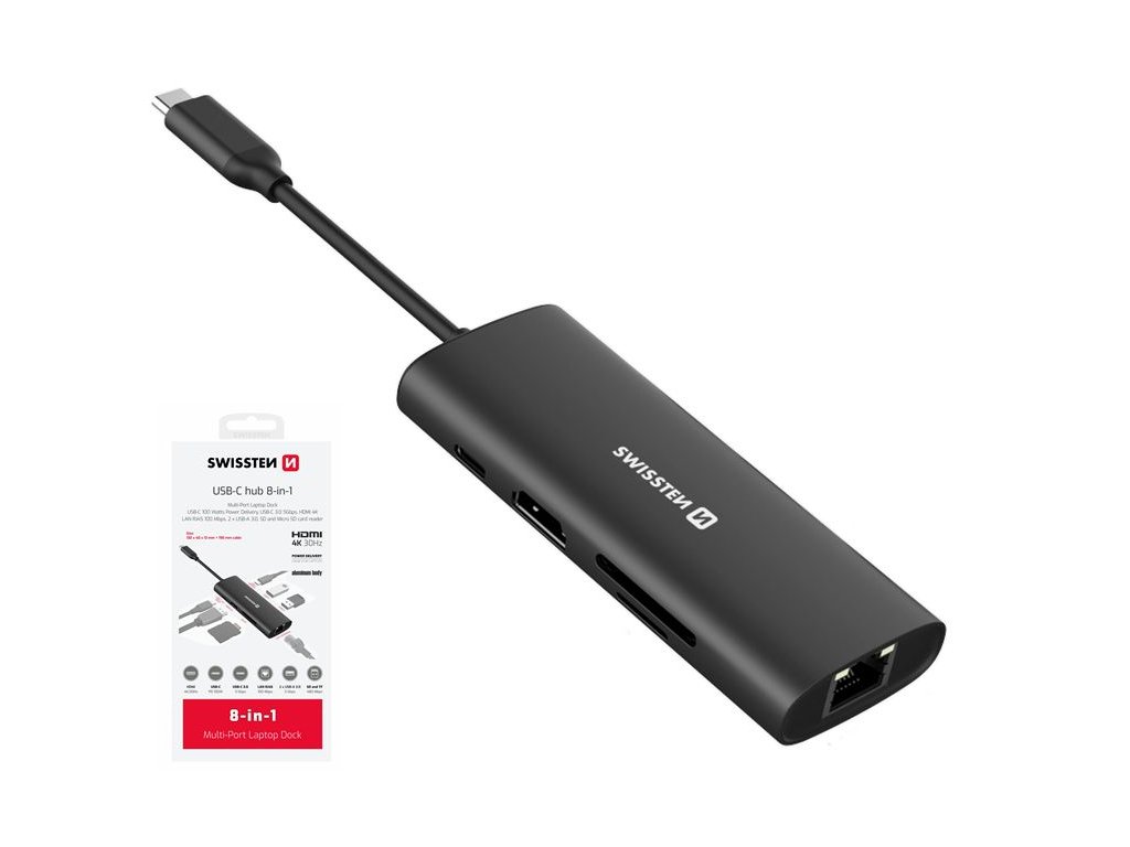 SWISSTEN USB-C HUB 8v1 USB-C 100W, HDMI 4K, LAN RJ45, 2x USB-A, 1x USB-C 3.0, SD, microSD