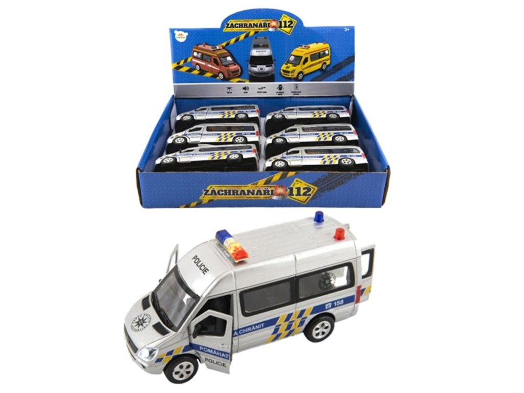 (BAL:6ks) Autíčko na zpětné natažení.Design: série záchranáři - policie.Kovové autíčko pro malé strážce zákona je vyrobeno s plastovými doplňky. Otevírací přední a zadní dvěře. Vydává zvuky startování a houkačky. Má efekty blikajících světel. Rozměr: 15 x 6 x 7,5 cm. Vhodné pro děti od 3 let. Napájení: 3x AG13 (součástí). Barva: stříbrná.Prodej po 6ks v boxu.Rozměr boxu: 35 x 26,5 x 7 cm.Cena za jeden kus.Doplňkové parametry