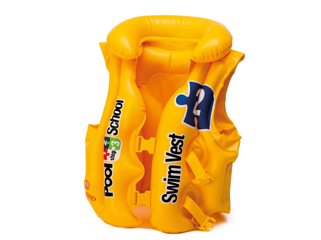 (BAL:1/24ks) Dětská nafukovací plavací vesta pro bezpečnost dětí s pohodlným límcem a dvěma nastavitelnými přezkami ve žluté barvě. Vesta má třikomorový systém a zpětný ventilek. Doporučeno pro děti ve věku 3–6 let. Maximální zatížení 18-30kg. Velikost 50 x 47 cm. Rozměr balení: 13x19x4cm.Doplňkové parametry