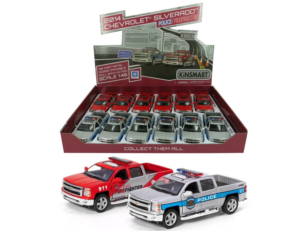 (BAL:12/72/144ks) Věrný kovový model auta Chevrolet Silverado policie, hasiči.Na zpětné natažení. Otvírací dveře.Design: policie, hasiči. Poměr 1:46.Užijte si spoustu zábavy s tímto krásným autíčkem, které je vyrobené z kovu.Výroba s oficiální licencí automobilky.Rozměr: 12,5 x 6 x 4,5 cm.Vhodné pro děti od 3 let.Barva: červená, modrá, černá, zelená.Prodej po 12ks v boxu.Rozměr boxu: 39,5 x 28 x 4,5 cm.Cena za jeden kus.Doplňkové parametry