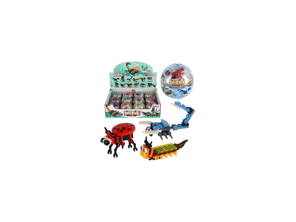 (BAL:1/12/144ks) Stavebnice brouk. Ze 12 stavebnic lze sestavit velký škorpion. Design: různí broučci.Velikost: 6cm. Druhy: 12 druhů, žádný není stejný. Balení: v kouli. Materiál: plast. Vhodné pro děti od 6 let. Prodej po 12ks v boxu. Rozměr boxu: 26,5 x 20 x 7,5cm. Cena za jeden kus.Doplňkové parametry