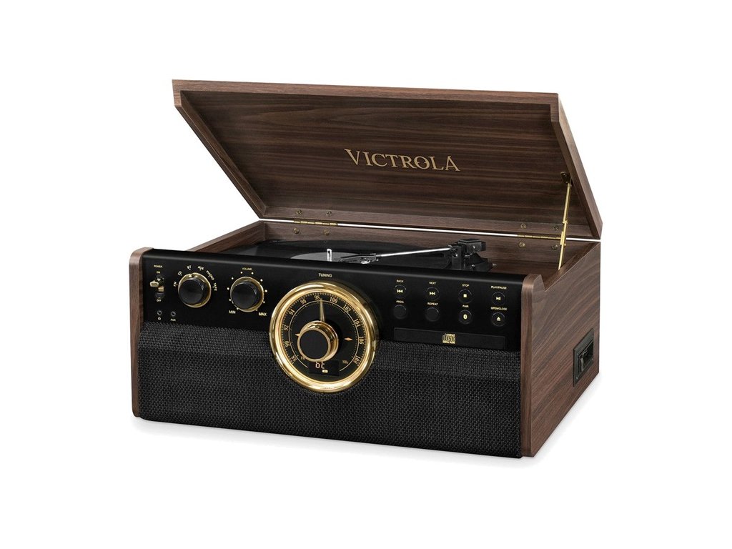 Gramofon Victrola VTA-270B je díky vestavěnému reproduktoru a modernímu designu 20. století ideální pro milovníky vinylu. Streamujte hudbu přes Bluetooth nebo přehrávejte své oblíbené melodie pomocí FM rádia, CD nebo kazetové mechaniky nebo prostřednictvím 3,5 mm audio vstupu.Doplňkové parametry