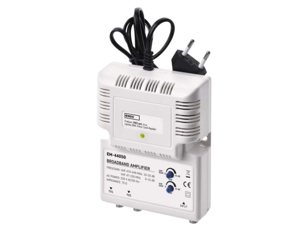 5G filtr: ano|frekvenční rozsah: 47–230 MHz, 470–698 MHz|izolace mezi vstupy: neuvádí se|konektory: F konektor|krytí: IP20|LTE filtr: ano|maximální úroveň signálu na výstupu: 108 dBµV|napájení: 230 V +/-10 %, 50/60 Hz, 3 W|počet vstupů: 1|počet výstupů: 2|potlačené pásmo: 400–470 MHz, 699–2 200 MHz|prodejní obal: 1 ks, krabice|produkt: širokopásmový domovní zesilovač|průchozí pro stejnosměrné napájení předzesilovačů: ne|regulace zisku: 0–15 dB|rozměr: 105 × 135 × 40 mm|rozteč děr: neuvádí se|šumové číslo: <3,0 dB|útlum v potlačeném pásmu: neuvádí se|vstupy: F konektor|zesílení: 25 dBDoplňkové parametry